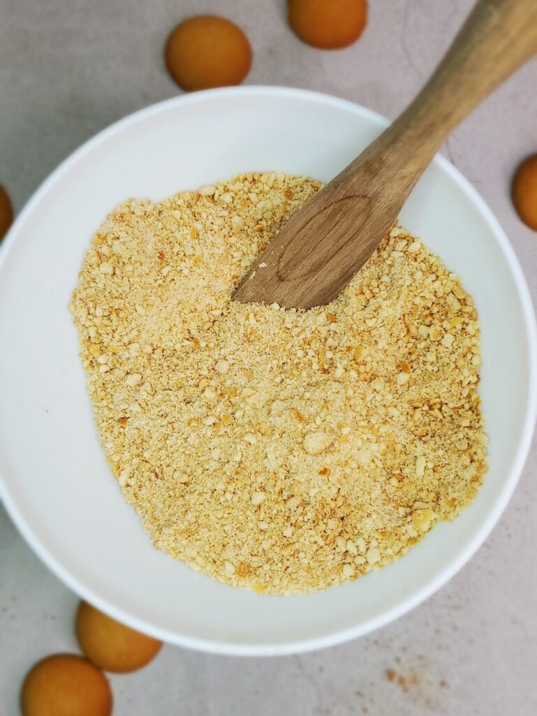 Add them to a mixing bowl and stir in the granulated sugar and melted butter. It will start resembling a damp sand texture.