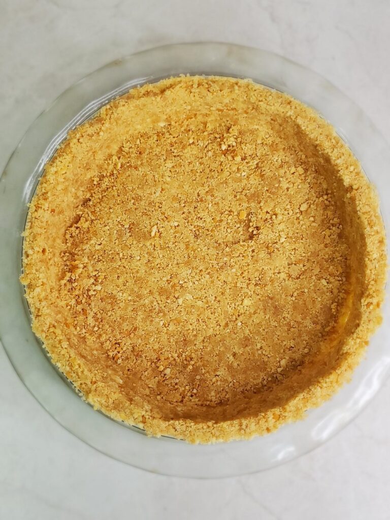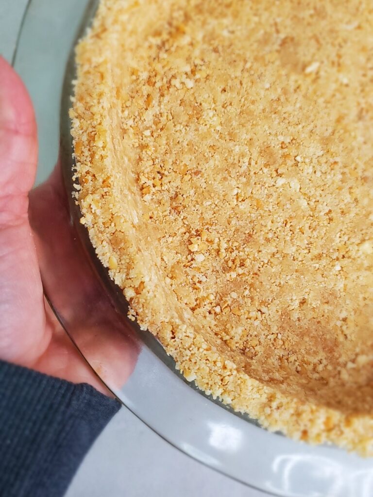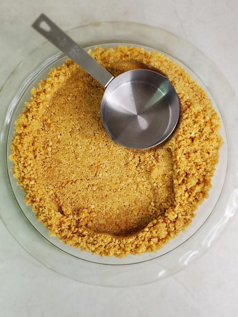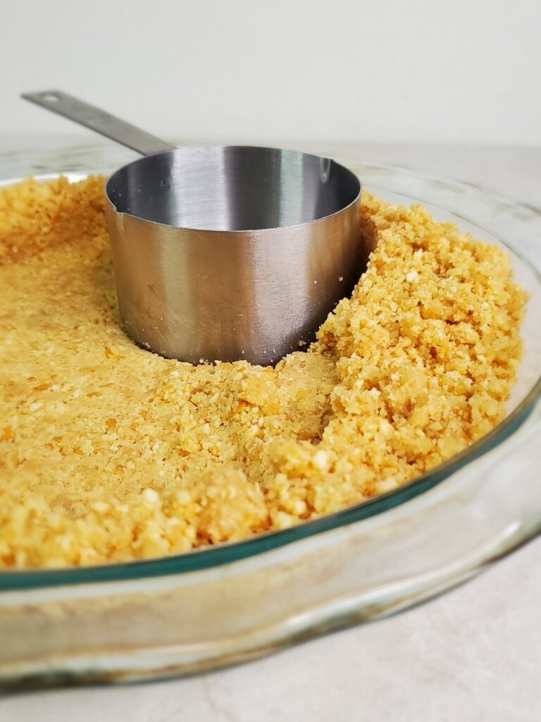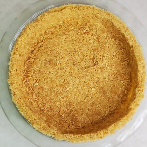 Pour this into a non-greased 9 and 1/2 -inch pin pan. Using a mixing cup with a smooth bottom on it gently work and pat down the crust down on the bottom and around the edges. Be careful not to overpack. You want it to be firm but if you pack it too tight it will be hard to cut later.